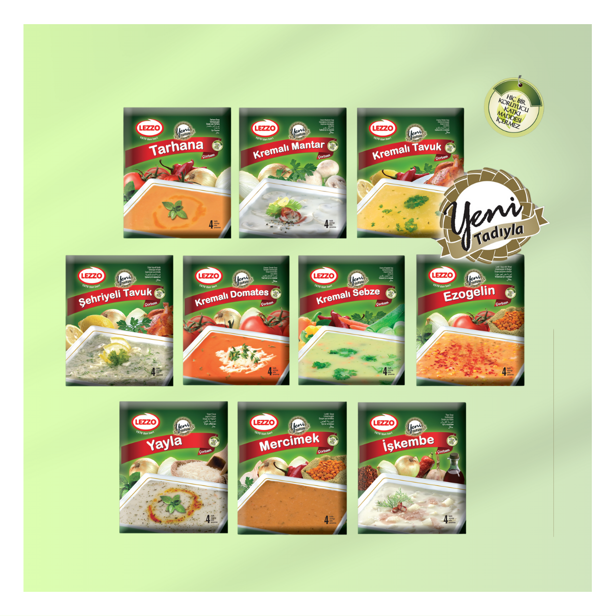 LEZZO Çorbanın nefis 10 ayrı cesidi vardir. Kremalı Domates Çorbası, Kremalı Mantar Çorbası, Kremalı Tavuk Çorbası, Ezogelin Çorbası, İşkembe Çorbası, Yayla Çorbası, Şehriyeli Tavuk Çorbası, Tarhana Çorbası, Kremalı Sebze Çorbası, Mercimek Çorbası. 4 değişik ambalaj içerisindedir: 12 poşetlik bir arada kutuda,1 kg'luk karton kutuda, 3 ve 4 kg'lik kovada.